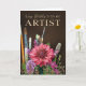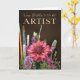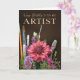 A rich, expressive birthday card for an artist who works with canvas, brushes, color and imagination. The front design features a deep chocolate-brown backdrop, highlighting a striking pink canvas flower bloom surrounded by soft purple florals, delicate buds, and painter’s brushes in varied shapes and textures. This arrangement visually represents creativity, talent, and artistic flow — perfect for someone who breathes life into color and canvas.