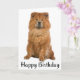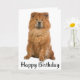 This cute birthday card features an adorable reddish brown Chow Chow pup highlighted against a crisp white background with Happy Birthday printed in a bold black calligraphy style font.