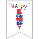 This bunting banner showcases the words "Happy Birthday" in a unique print font, style and placement with red, blue and yellow letters plus a birthday hat with streamers in this birthday theme and style. All banners have single sided printing outdoor safe made with sturdy plastic polystyrene and thick plastic rope has (16) 5.5" x 8" swallowtail flags on a 6' long string.