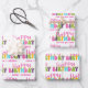 Set of 3 Happy Birthday wrapping paper sheets. Two of the sheets can be personalised to someone or from someone and the 3rd sheet has no personalisation. The design has colourful candles lettered in cute and whimsical, groovy retro typography in pink, purple, lime green, turquoise blue and yellow.