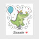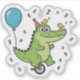 "Celebrate in style with this adorable and whimsical green crocodile! Featuring a happy gator riding a unicycle, wearing a festive party hat, and surrounded by colorful confetti, blue balloons, and chirpy little birds. This playful illustration is perfect for kids' birthday invitations, nursery decor, stickers, or personalized gifts. A fun and vibrant design that brings a smile to any celebration!"