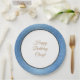 Party paper plate shown in a fun Blue faux glitter print around the rim and White centre. Happy Birthday along with your custom name choice written in centre.