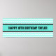 Customisable name and age happy birthday banner poster in fun and bold bright turquoise blue, black and white retro chevron zigzags stripes pattern.