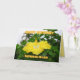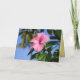 This card featuring a deep yellow hibiscus with a white throat is perfect to personalise for many occasions. In the background is a tropical garden, crowned by a coconut palm. On the back of the card is a beautiful pink hibiscus.