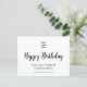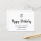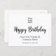 This postcard has text on both sides. Front: You can add your logo to this postcard. The logo will be above a script that says Happy Birthday. Two lines of display text are below the script for your personalized message. Back: The back has text you can edit to show your business name, special offer, offer terms, or a custom message. The postcard is white. The text is black.