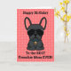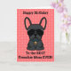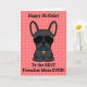 Frenchies, show your Mom some love on her birthday with a personalized card just from you. Message on the front of the card reads “Happy Birthday to the Best Frenchie Mom Ever!" Inside message reads “I love you more than treats, Happy Birthday.” The design features a cute cartoon style illustration of a male black colored french bulldog wearing a blue collar and black aviator sunglasses. Font and background color and be changed by selecting “Click to customize further.”