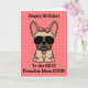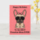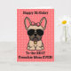 Frenchies, show your Mom some love her birthday with a personalized card just from you. Message on the front of the card reads “Happy Birthday to the Best Frenchie Mom Ever!" Inside message reads “I love you more than treats, Happy Birthday.” The design features a cute cartoon style illustration of a female light fawn colored french bulldog wearing a pink bow and collar. Font and background color and be changed by selecting “Click to customize further.”