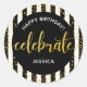 “Happy birthday”. Here’s an unique addition to your birthday fête! “Celebrate” with this bold, stunning, modern sticker for an event to remember. Sparkly gold glitter handwritten calligraphy script and dots overlay a black and white striped background. Personalise the custom text with your guest of honour’s name. Choose from a round or square shape. Guaranteed to add stylish fun to her special party! Matching and coordinating invitations, napkins and other birthday goodies are also available in this trendy and special collection.