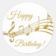 An elegant white background with faux gold music notes. With the text: Happy Birthday! Golden hand lettered style script.