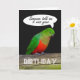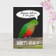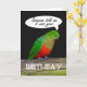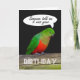 A green and red King Parrot, sitting on a rail with a black background.There is a speech bubble which reads " Some one told me it was your ..." and at the bottom in capitals " BIRTHDAY. It is blank inside.