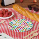 Paper plate with a happy birthday message and colourful and bright pattern of gummy bears. The gummy bears face sideways or forward. This is a colourful, fun, candy design with customisable words.