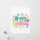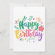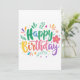 A vibrant and colorful birthday greeting card design featuring the words 'Happy Birthday' in playful, artistic fonts. The letters are adorned with various floral elements and cheerful decorations, including leaves and colorful dots, creating a festive atmosphere. The overall composition is lively and joyful, perfect for celebrating a special occasion.