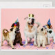 A joyful scene of five playful dogs wearing colourful party hats, surrounded by confetti.