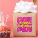 Square sticker to match our "Happy Birthday in Flowers" invitation with an image of “Happy Birthday” in big yellow letters on a background of whimsical flowers on pink. See matching custom-cut vinyl sticker, invitation, envelope, favour box, favour tag and label. See the entire Birthday Sticker collection in the INVITES | Stickers & Labels section.