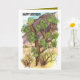 Happy birthday greetings featuring a Joshua tree in a southwest desert landscape with various plants and muted purple mountains and a touch of blue sky hand drawn with ink and painted with watercolor. On the inside is a shade of coordinating olive green and text you can edit to fit your needs.