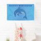 This cloth event banner is vibrant blue covered in water bubbles with a jumping fun dolphin who is a faux sparkle like blue and white. Customise the Happy Birthday text with the template.