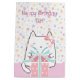 An endearing doodle-style kawaii cat captures a gift box, on pink ground. It stands against a backdrop of pastel and rainbow-coloured stars. Using this gift box to wrap a present will surely bring a smile to the recipient. Moreover, the theme allows for personalisation with the birthday girl's name, adding a truly unique touch.