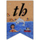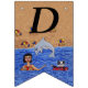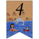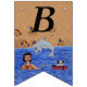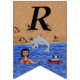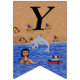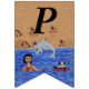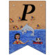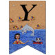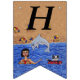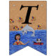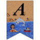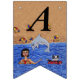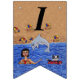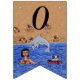 This flag shaped bunting banner has a lady and her black and white cat swimming in the ocean in colourful inner tubes with the sandy beach behind them and a grey dolphin jumping out of the water. Customise the Happy 40th Birthday text with the templates.