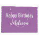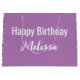 The happy birthday gift bag is lavender. The recipient's name is in white script. Happy Birthday is above the script. The name (Shown: Melissa) appears in elegant script. The other text is also white. All of the text can be edited.