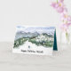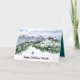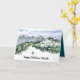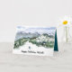 Personalized happy birthday greetings featuring skiers on the slopes at an alpine lake with trails running through the forest and a calm sky above hand painted with watercolor. On the inside is a shade of teal blue and text you can edit to fit your needs.