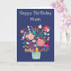 A colourful birthday card featuring a vase of bright flowers. Dark blue background. The wording at the top of the card says "Happy Birthday Mum". Blank inside for your own message. Size 5" x 7".