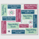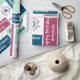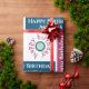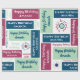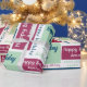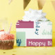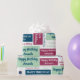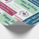 Add a name in the sidebar to create special custom gift wrap which reads, "Happy Birthday [Name]" on blue, mint green, and dark pink geometric colour blocks in various fonts on a white background.The words "happy birthday" are also repeated in dark blue, light green, and pink text in script, handwritten, and serif fonts directly on the white background. The repeating blocks and text create a colourful abstract geometric pattern.