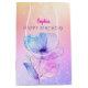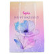 For any birthday, a pink and blue watercolor flower with personalised name on gold, pink and purple background.
