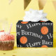 White "Happy Birthday" text on a black background with orange pickleballs.