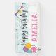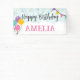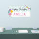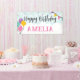 A bright and fun banner for a birthday party that is customizable for the birthday party person's name. It has a blue starburst background bordered with balloons and stars on clouds, with a party flag in the corner. In feminine colors of purple, yellow, pink and green.