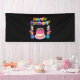 This banner showcases a design that has a birthday cake displaying the words "Happy Birthday" on top in a bubble style print font with gifts and balloons on each side. This design also features a cartoon style happy birthday with party hat and shapes inside of the letters across the top in this birthday theme and style. This banner has single side printing outdoor safe measures 2.5"x6" made with an elegant matte finish and is both fade and tear resistant for Indoors or outdoor use great for advertise anything, from birthdays to graduation, weddings to anniversaries. Hemmed and thermally welded edges for neat finish outdoor banners can be bought with metal grommets.