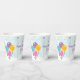 A fun birthday cup with the background of a blue starburst, clouds, stars and balloons. Customizable with the birthday party person's name and the bright colors will be sure to pep up any party.
