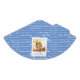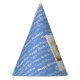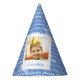 Happy Birthday Pattern Blue Party Kids Photo Personalised Birthday Party Paper Hats. Pattern of white script "Happy Birthday" repeated in on a light blue background. Customise to change background to another colour. Fun photo frame design appears to be taped to hat. Name of child written on white underneath photo. Replace with a photo of the birthday kid. Personalised fun birthday party supplies for kids or adults.
