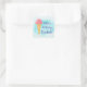 A sticker that says: Happy Birthday personalised with a name. Illustrated with a pink scoop of ice cream in a waffle cone. Set on a turquoise blue watercolor paint splatter / brushstroke.