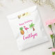 Just personalise with your information! Favour bag features an original marker illustration of a tropical island palm tree, pineapple, and pink flamingo.