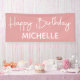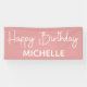 Basic, simple pink and white "Happy birthday" party banner customised with the name of the guest of honour in a whimsical script font.