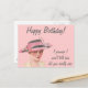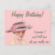 This postcard features a vintage image of a woman, on a pink background. The text reads, "Happy Birthday! I promise I won't tell how old you really are."