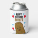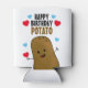 Fun happy brown potato surrounded by red and blue love hearts with Happy Birthday Potato in black and brown lettering above his head.