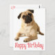 This fun canine postcard features an image of a beautiful chubby Pug puppy with a birthday greeting printed in a swirly red font highlighted against a crisp white background. The back of the postcard is blank for your message.