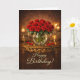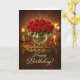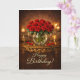 A luxurious birthday design showcasing a lush bouquet of deep red roses arranged in a clear glass vase on an ornate gold table. Warm candlelight glows softly in the background, with scattered rose petals adding a romantic, timeless feel.