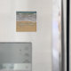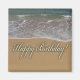 Beautiful blue ocean with white waves and sandy beach and Happy Birthday in script font.