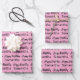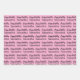This pale pink wrapping paper has black script that says Happy Birthday. It also has black text for the recipient's name. (Shown: Samantha) The text is in a pattern.