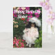 A cute little black doll in Victorian style dress among flowers with the text Happy Birthday Sister.
