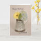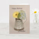 A birthday card for Sister with a yellow Gerber daisy and blue Hydrangea in a tin pitcher and a faded background with "Happy Birthday" on the top and "Sister" in script on the bottom.