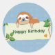 This classic round sticker features a cute, happy sloth hanging on the Happy Birthday sign. This sticker will complete your birthday card/gift and put a smile on the receiver.