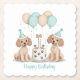 Cute cartoon illustration of Standard Poodle dogs wearing a birthday hat surrounding a birthday cake and balloons. Perfect for pet lovers or dog parents.