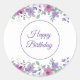 Small round happy birthday sticker is shown with a lovely purple floral print.
