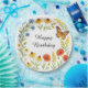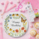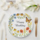 This party paper plate features a delightful digital watercolor design of blue bachelor buttons, vibrant black-eyed Susan's, and bold red poppy flowers, all set against a backdrop of lush green leaves. This cheerful floral arrangement is perfect for a summer birthday party or any festive occasion. It's available as a customizable template, so you can easily tailor it to match your unique party needs.
