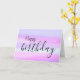 This beautiful and elegant card is the perfect way to wish anyone a happy birthday! The front of the card has the phrase "Happy birthday" in black brush (brushstroke) print and script lettering. A pastel watercolor wash in light blue, purple, and pink covers both the front and back of the card. The inside of the card is blank for your personal message.