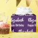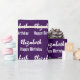 The birthday wrapping is dark purple. It has a text pattern for the recipient's name in a script and the phrase Happy Birthday. The name (Shown: Elizabeth) appears in an elegant script. The text is white. All of the text can be edited.