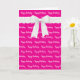 White happy birthday text, and a white bow on a neon pink background for a birthday.
